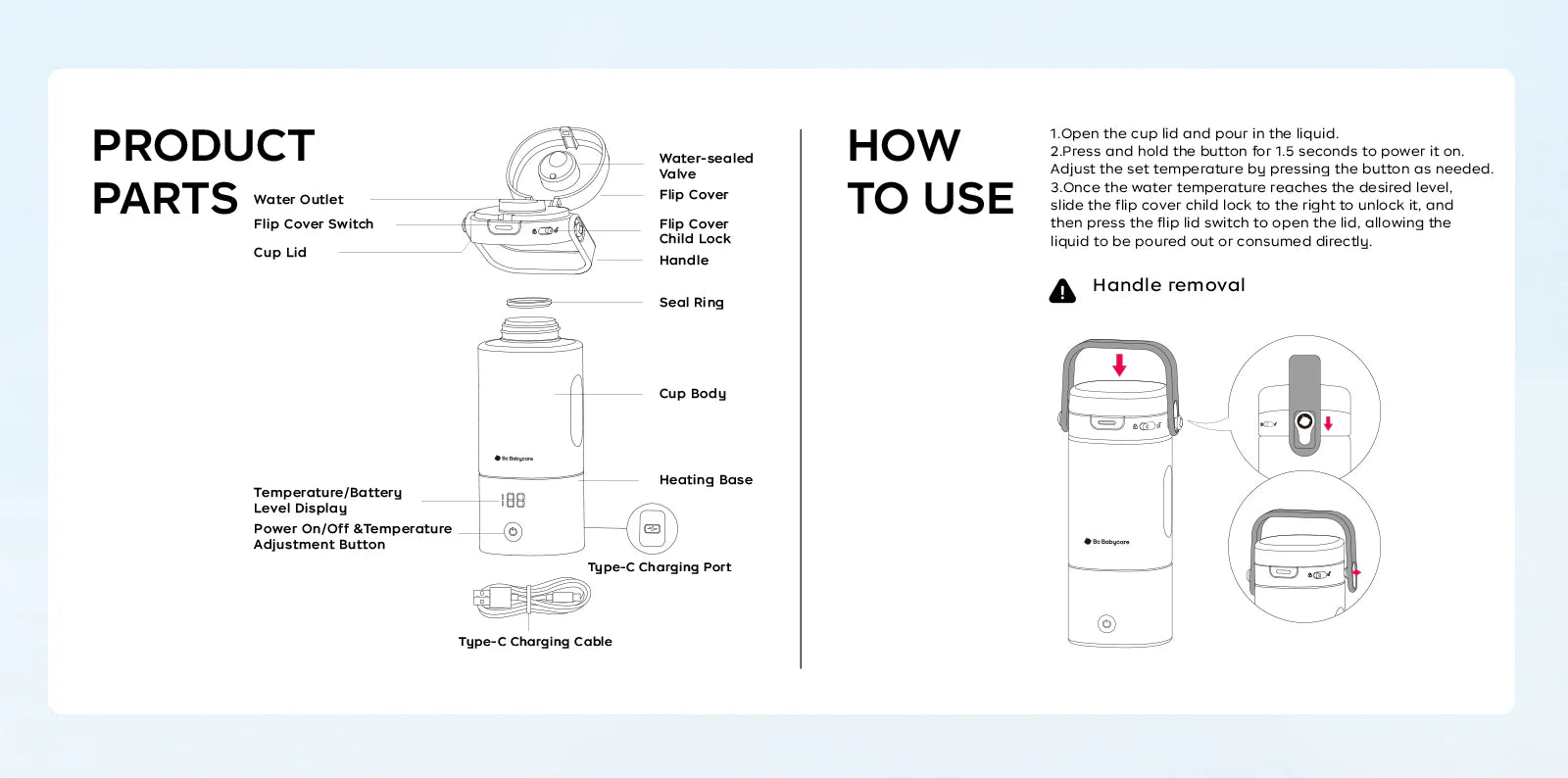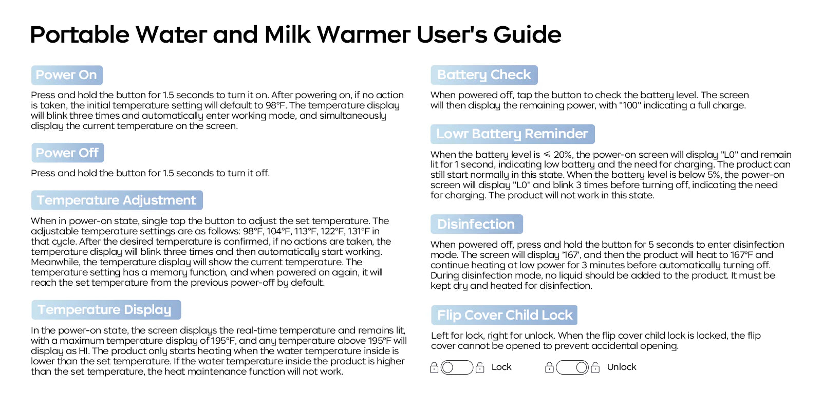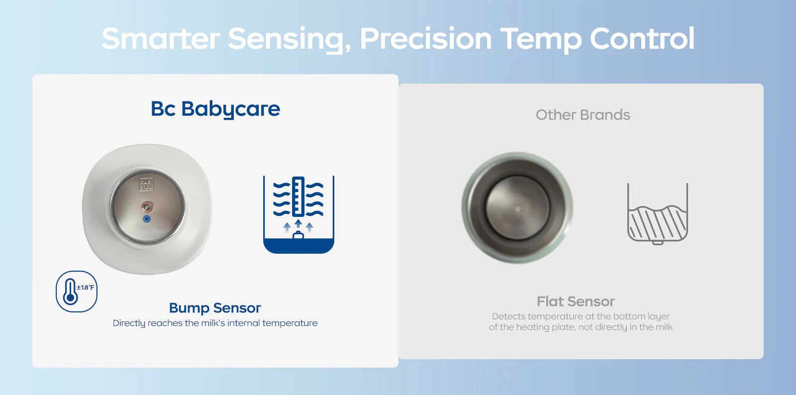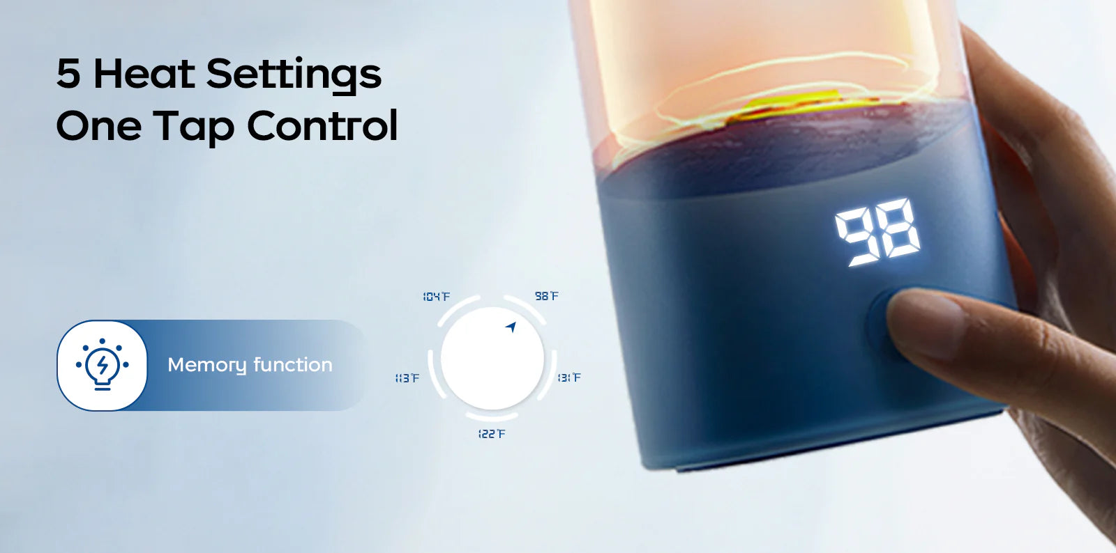 - Präzise Temperaturregelung: Erfasst die Flüssigkeitstemperatur genau für optimales Erwärmen. 5 Temperatureinstellungen (98 °F, 104 °F, 131 °F, 122 °F, 131 °F) erfüllen unterschiedliche Fütterungsbedürfnisse.