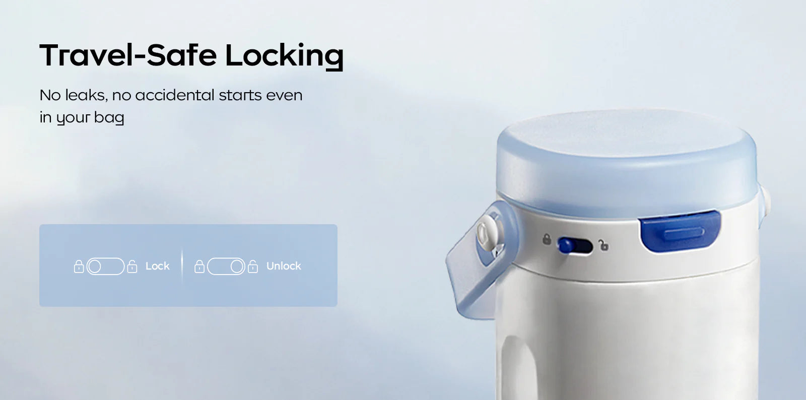 - Durchdachtes Design: Ein-Klick-Bedienung, leicht zu reinigendes Design, ein abgedichteter Ladeanschluss, der ein Spülen von bis zu 3 Minuten ermöglicht, und eine reisesichere Verriegelungsfunktion.