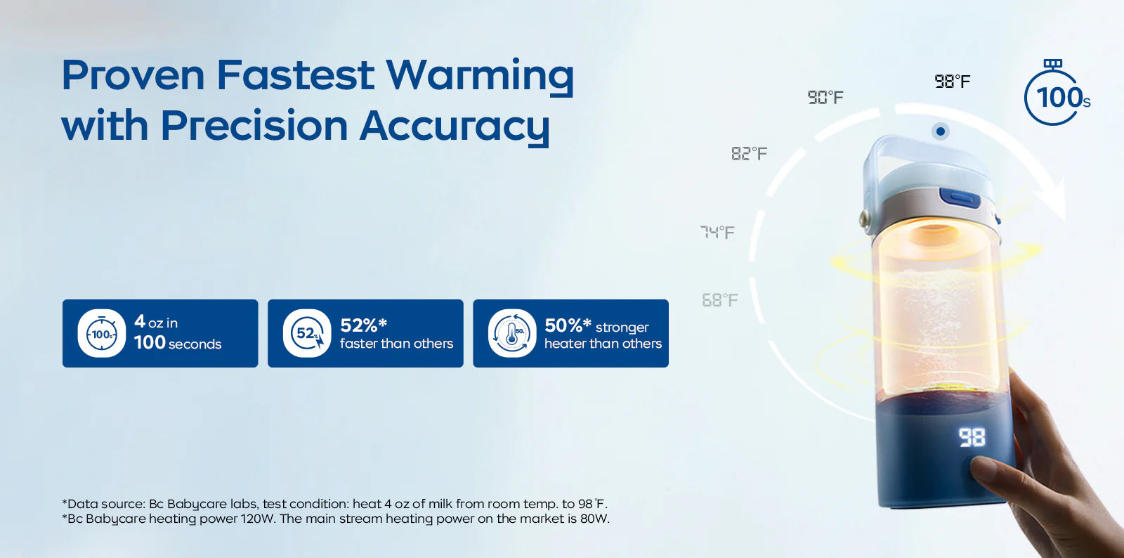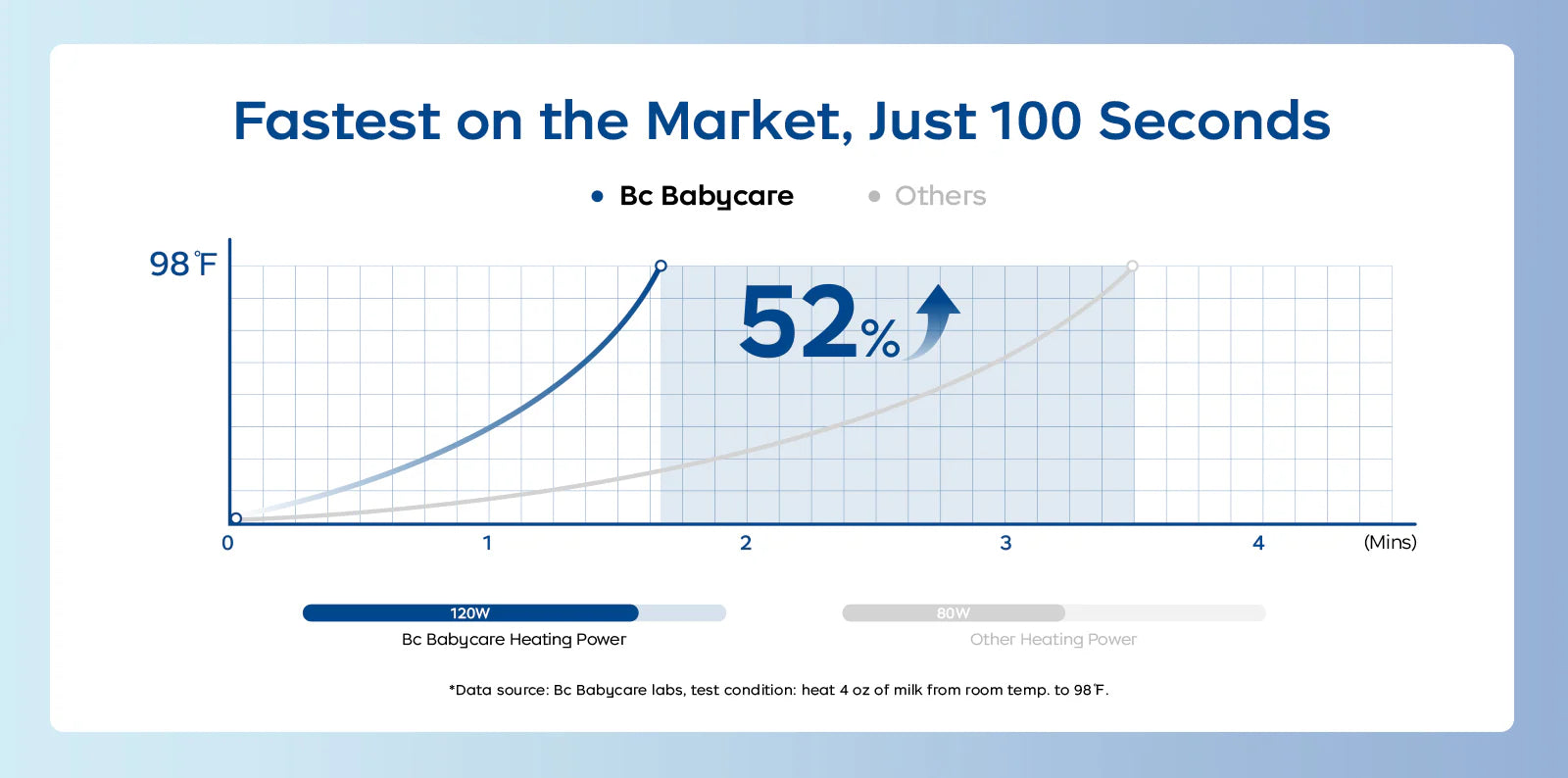 - Schnelleres Erhitzen: Erwärmen Sie 120 ml Milch in nur 100 Sekunden. So können Sie Säuglingsnahrung oder Milch schneller zubereiten, wenn es schnell gehen muss.