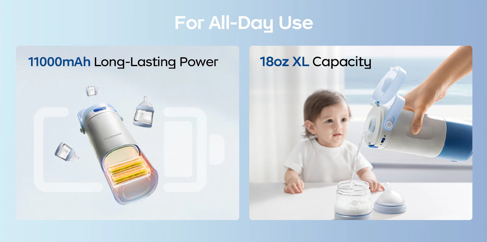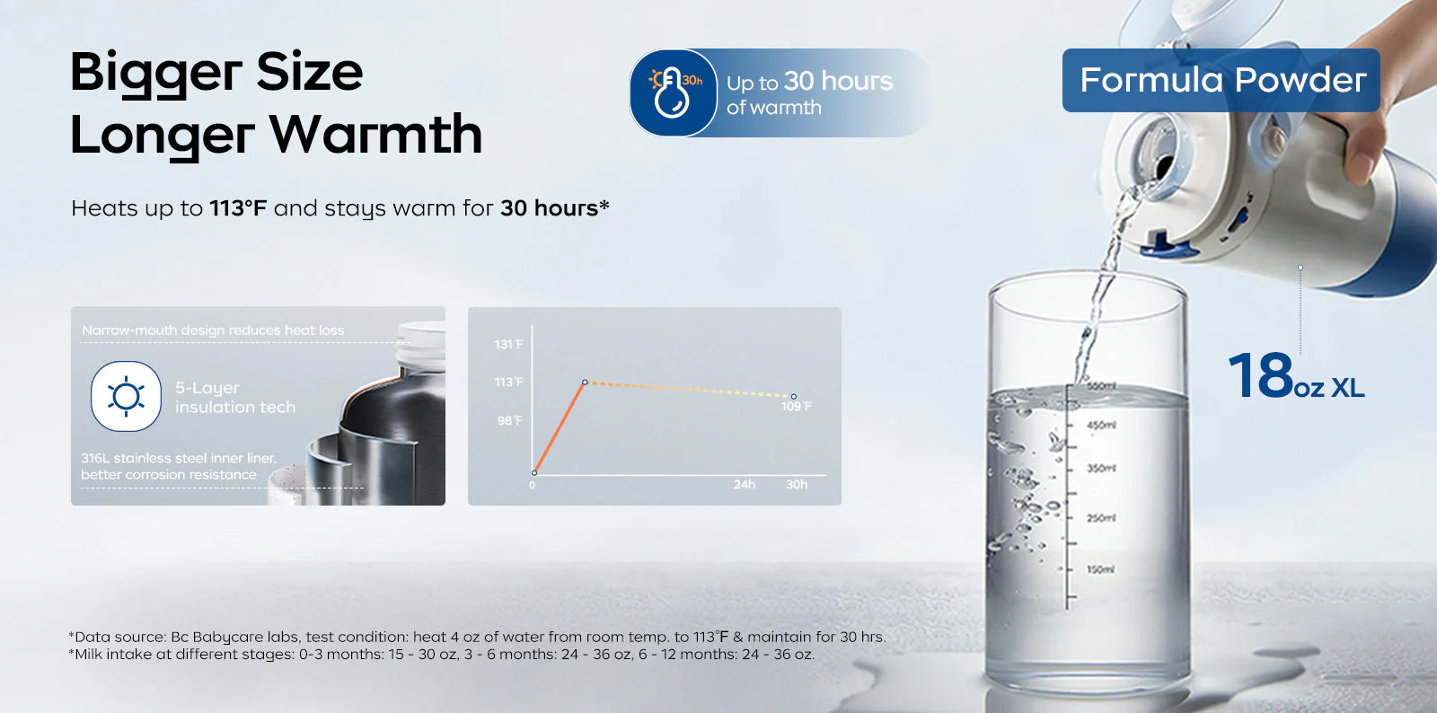 - Langanhaltende Leistung: Mit einem Fassungsvermögen von 530 ml und einem leistungsstarken 11.000-mAh-Akku spendet sie bis zu 30 Stunden Wärme. Ideal für nächtliche Fütterungen. Eine Wasserfüllung reicht für die ganze Nacht.