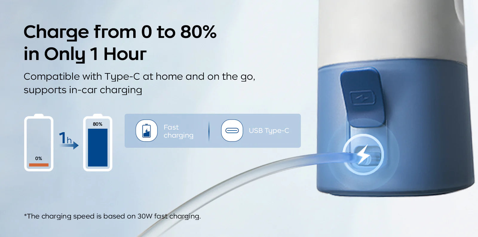 - Recharge rapide : entièrement chargée en 1,5 heure. Compatible avec le port USB-C à la maison et en déplacement.