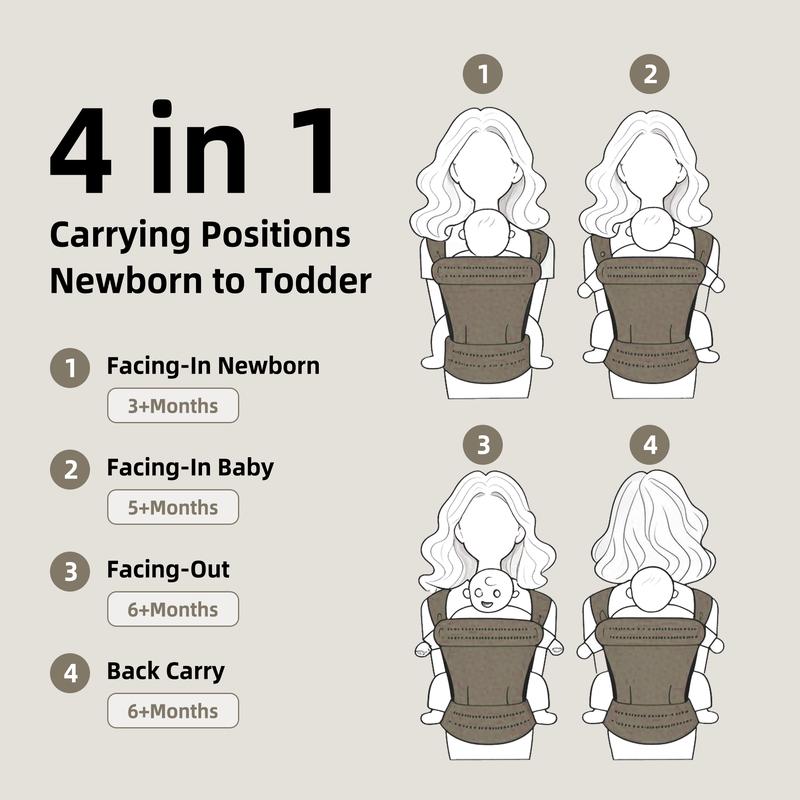 Our guidelines advise against using a face-out position for infants under 6 months due to their developmental needs for head, neck, and hip support. For older infants, our focus remains on ensuring proper support and safety, and we encourage caregivers to consult with their pediatrician to determine the most appropriate carrying method based on their child’s individual needs.