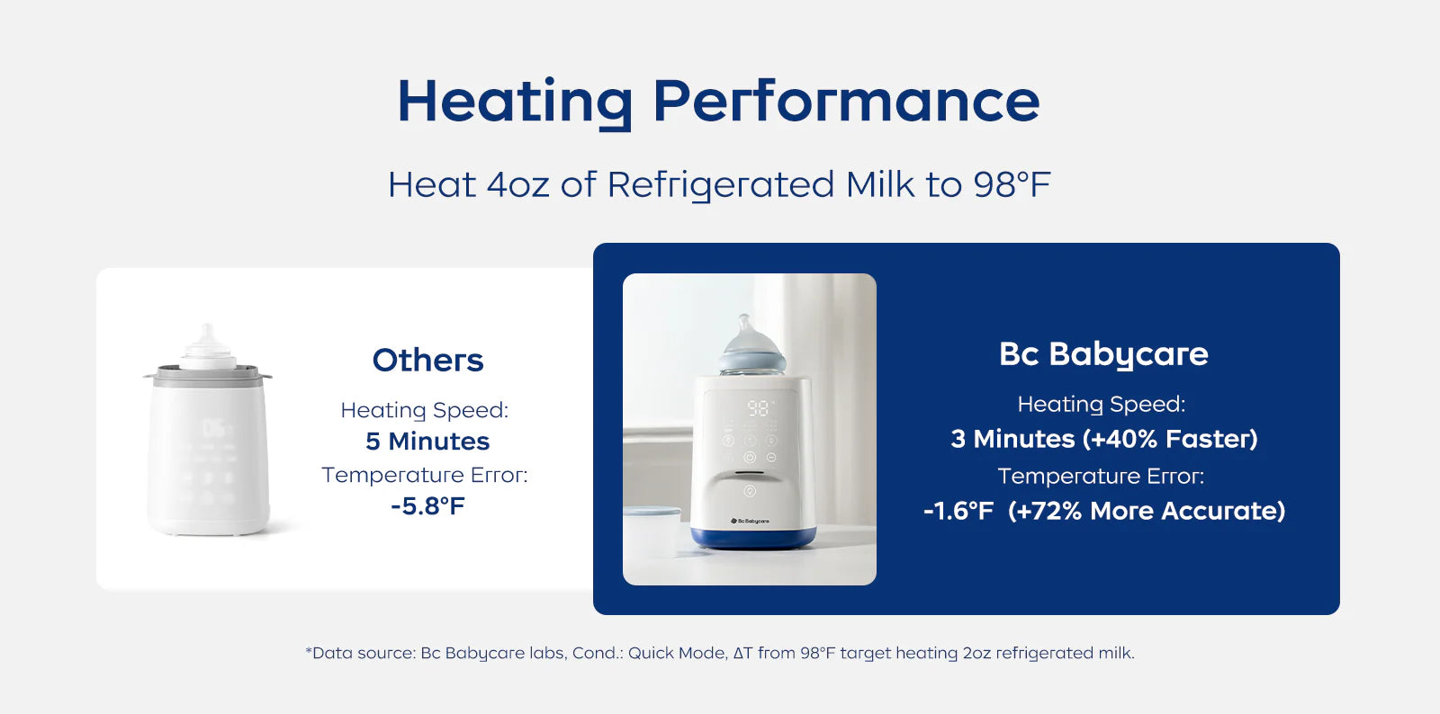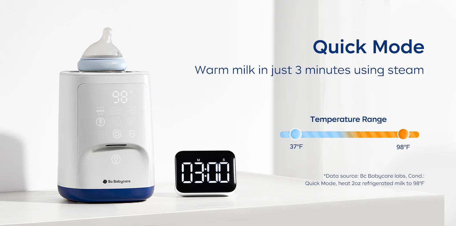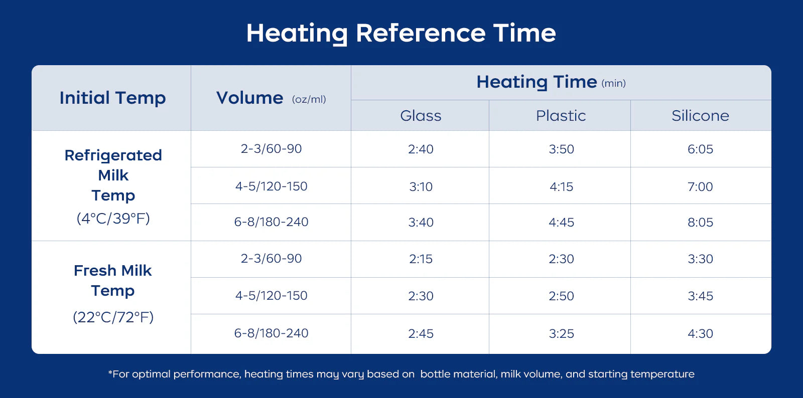 - 3-min Quick Heat-Up: Warms milk from fridge-cold (39°F/4°C) to feeding-ready (98.6–107.6°F/37–42°C) in just 3 minutes.